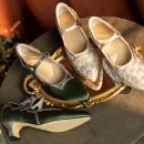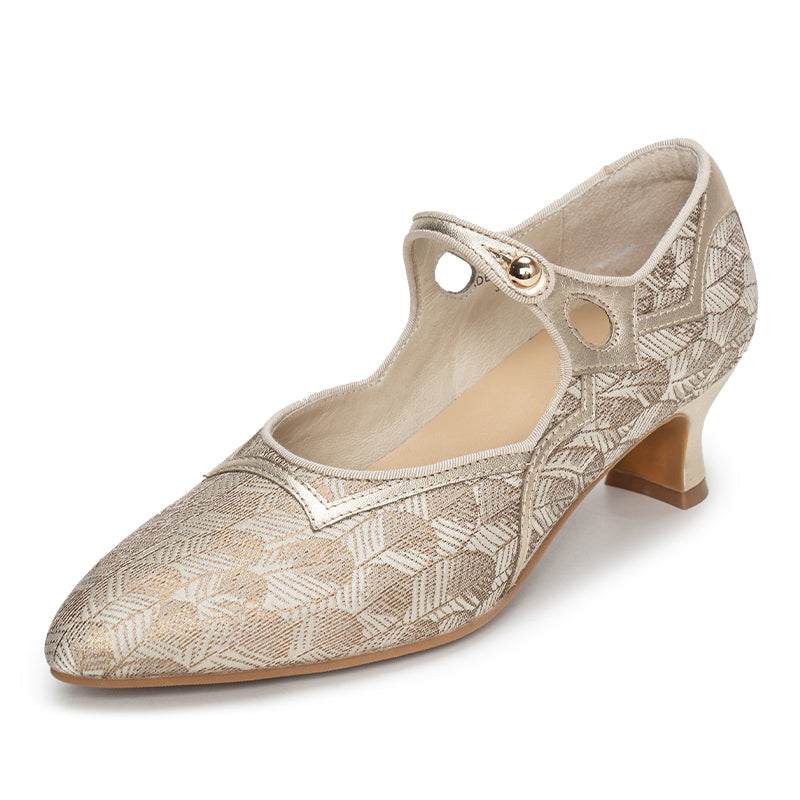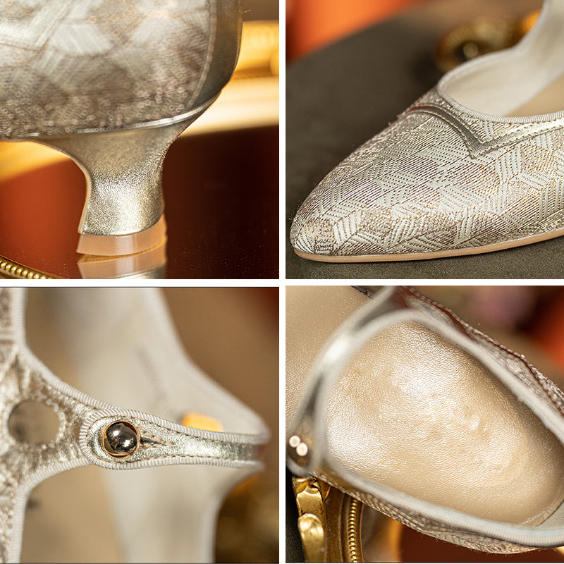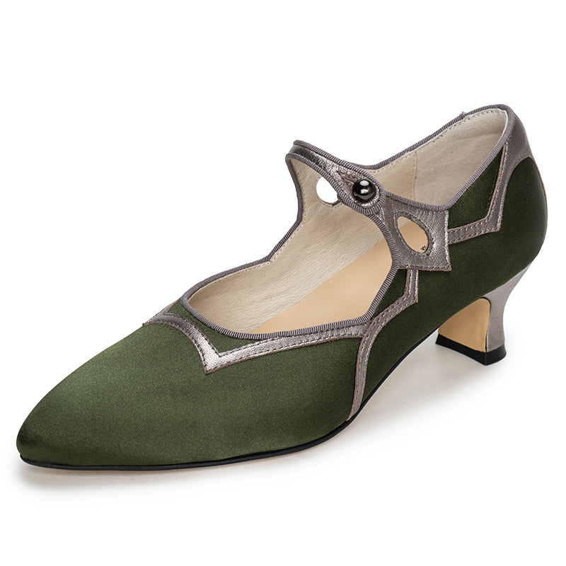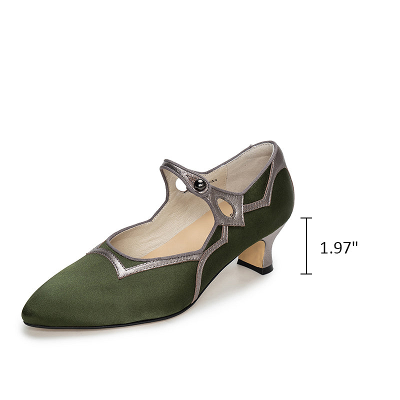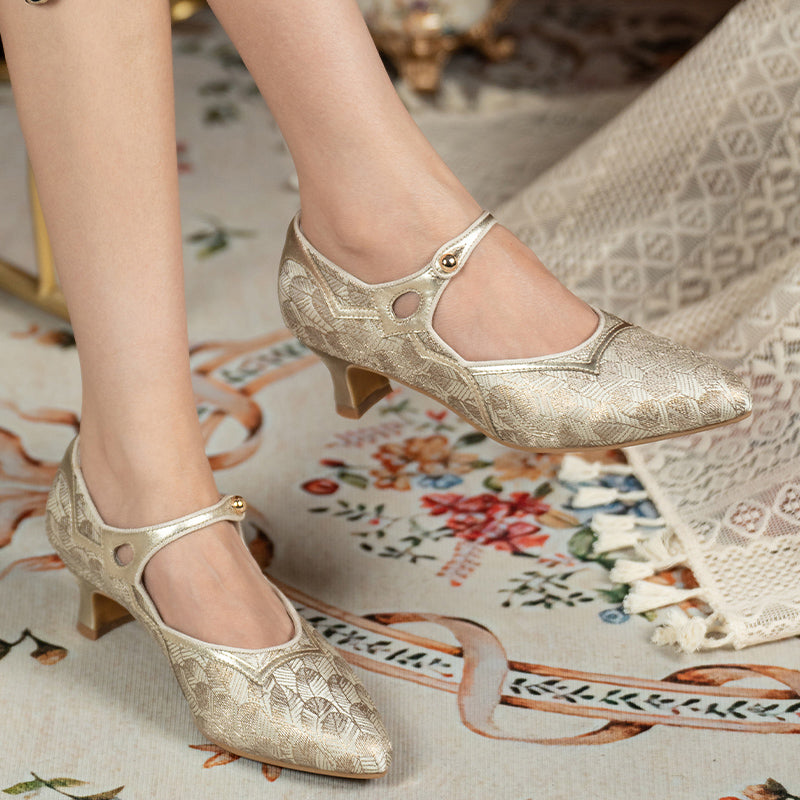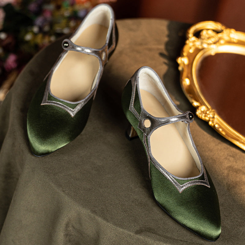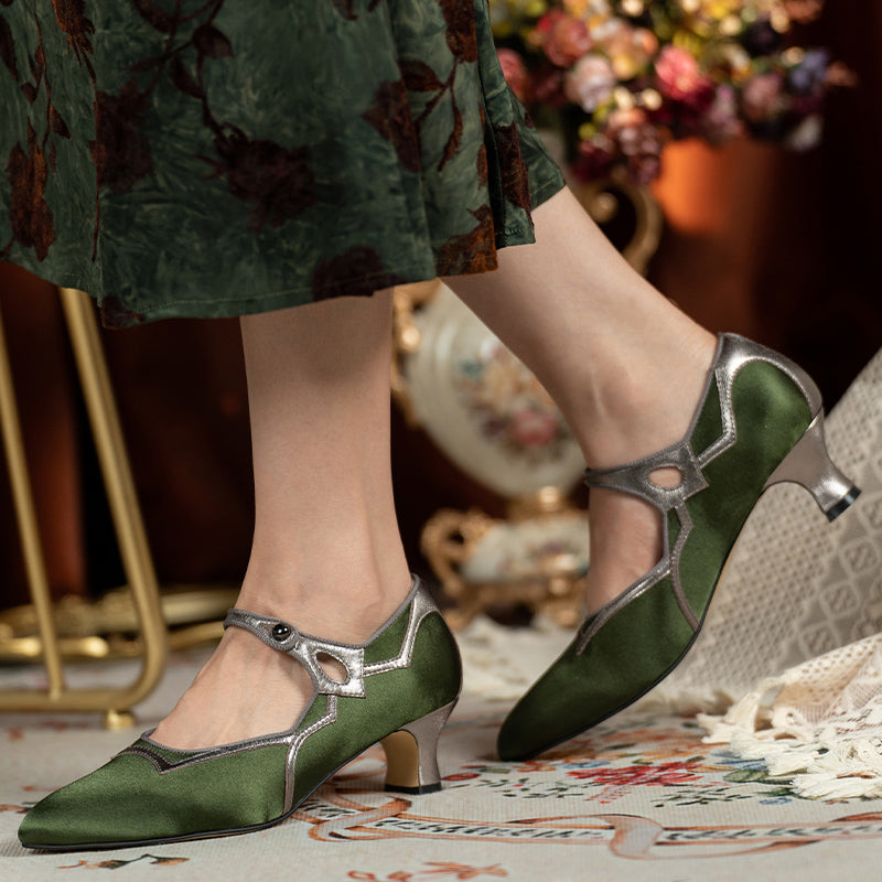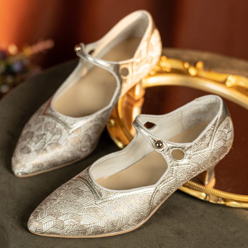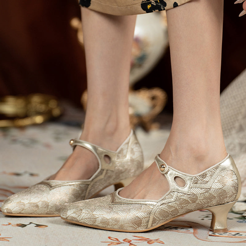 These vintage-inspired handmade Mary Jane pumps capture timeless elegance with a pointed toe, delicate single strap, and two-tone color design. The gold edition features luxurious jacquard fabric with light gold sheepskin, while the olive green version combines metallic gray leather with satin fabric for a sophisticated sheen. Set on a comfortable 50mm block heel with a durable rubber sole, these shoes are perfect for pairing with tea dresses, vintage lingerie gowns, or evening ensembles. A graceful fusion of classic craftsmanship and refined charm, ideal for retro and elegant occasions alike.
