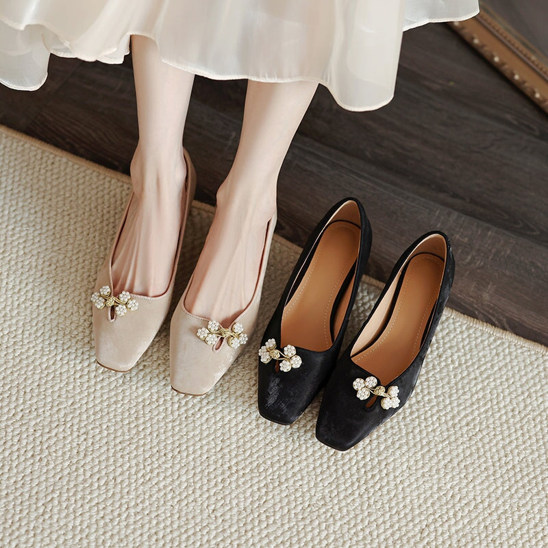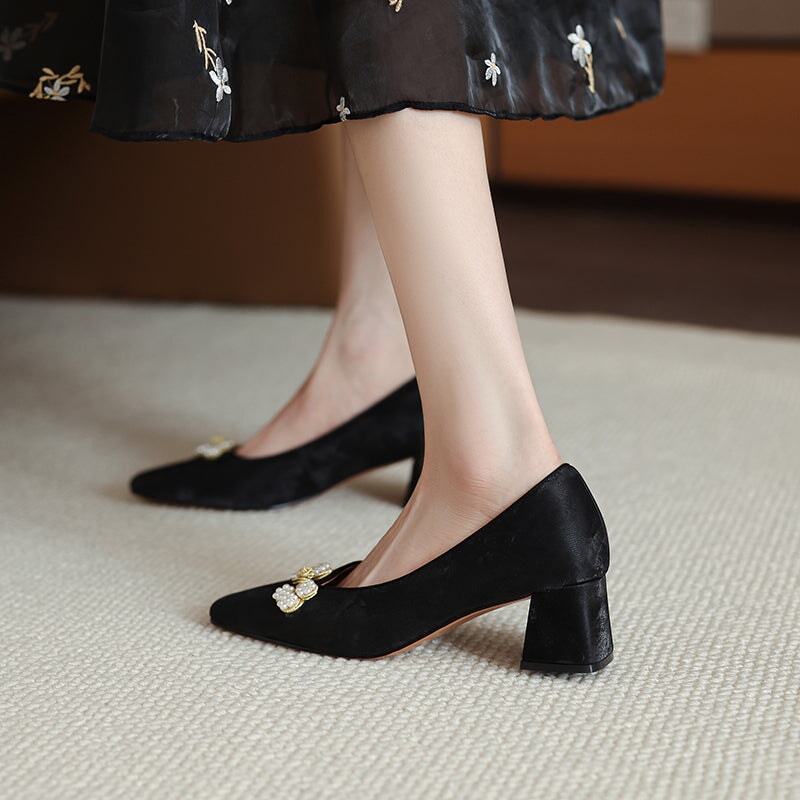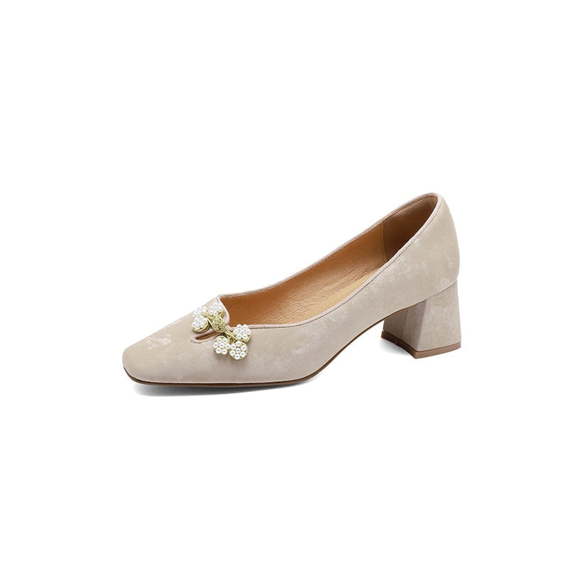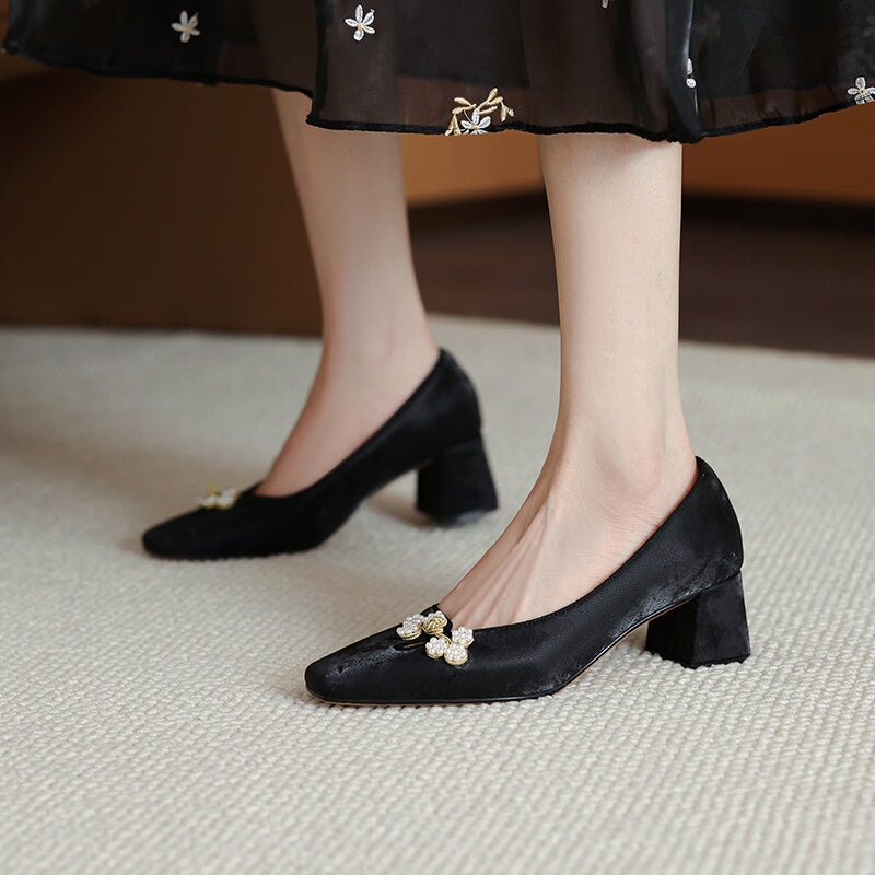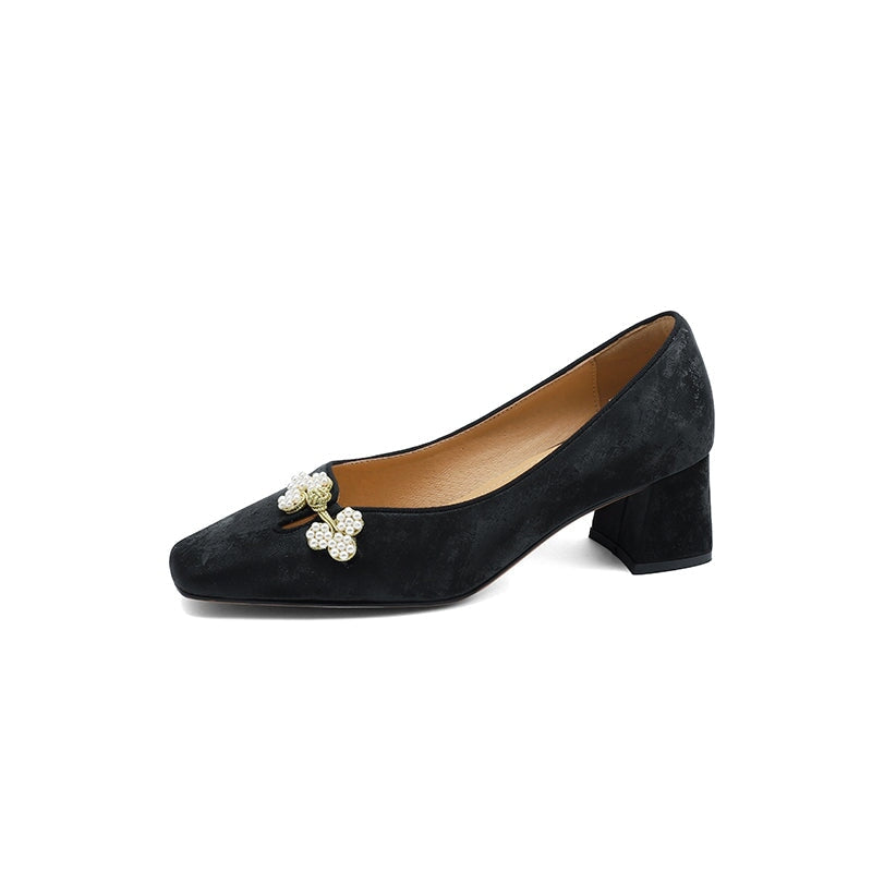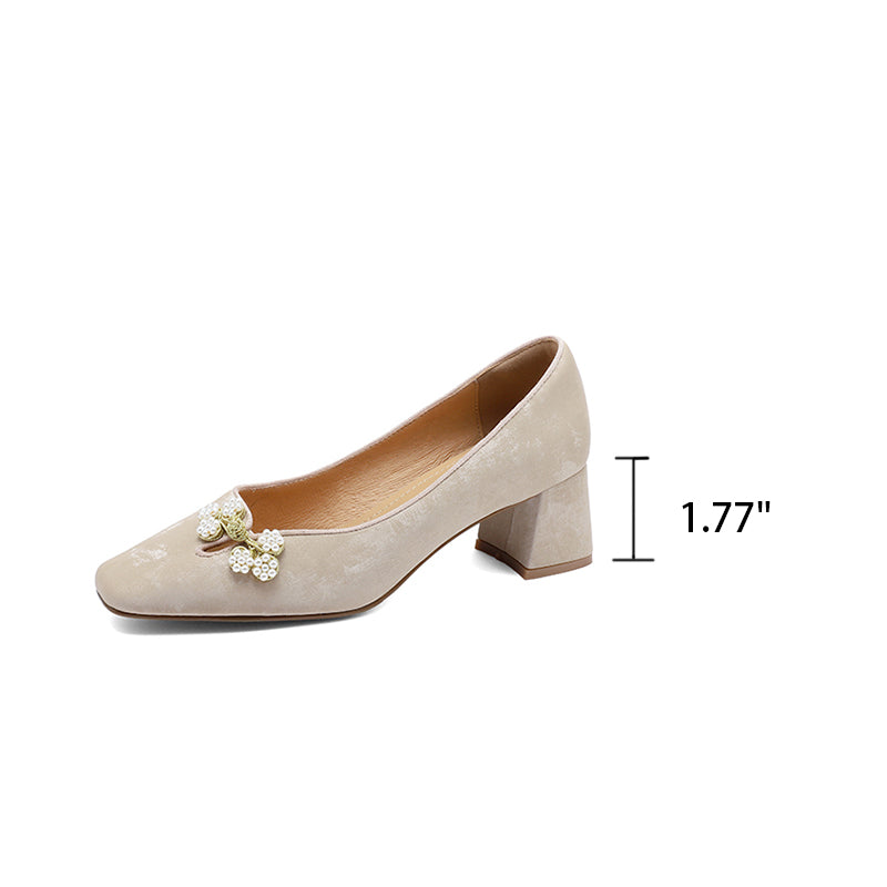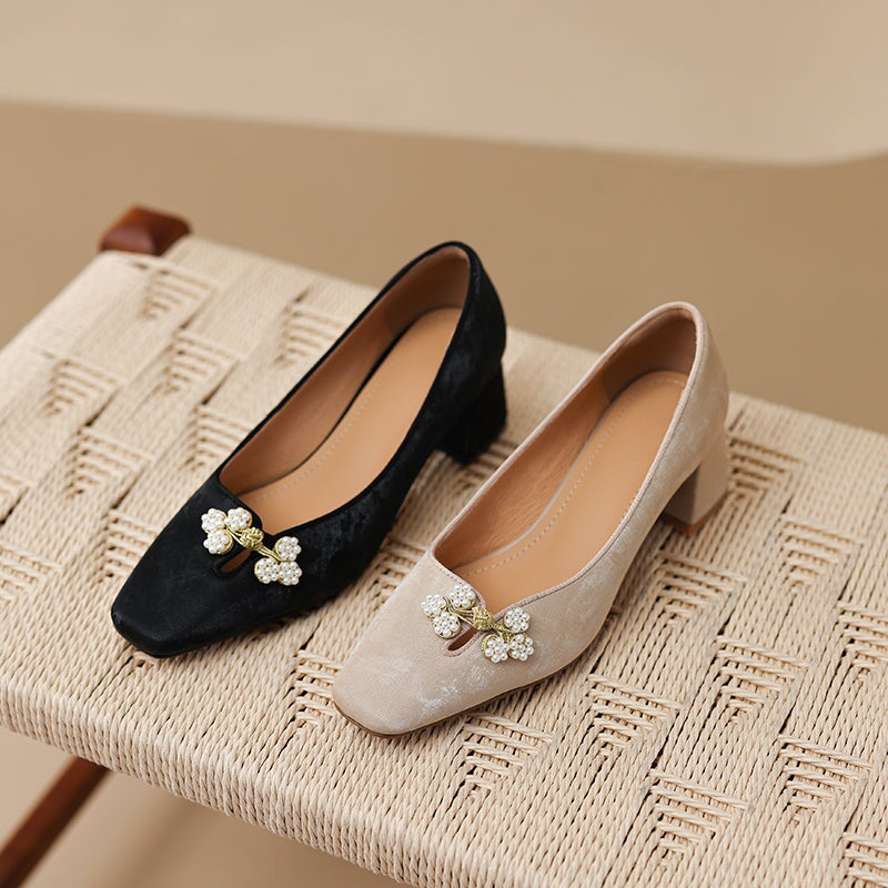Embrace timeless charm with these traditional Chinese-inspired pumps featuring an elegant square toe and delicate floral embellishment. Made from soft cow leather with a cushioned insole and 45mm block heel, these shoes offer both comfort and sophistication. The durable rubber sole ensures stability, making them ideal for daily wear or special occasions with a cultural flair.